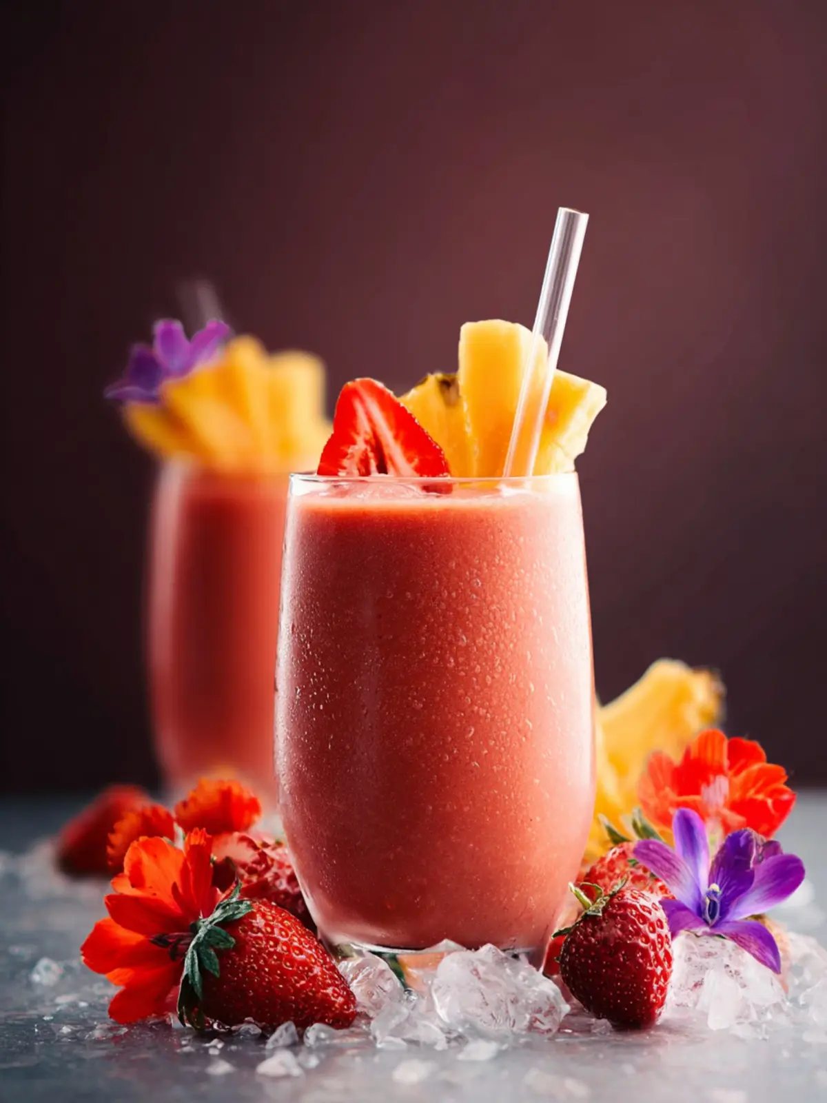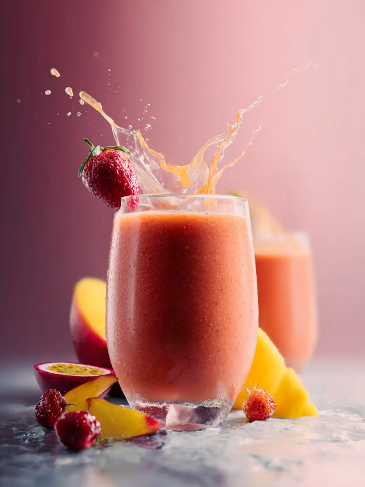 A delicious and refreshing smoothie made with passion fruit juice, strawberries, and other frozen fruits.