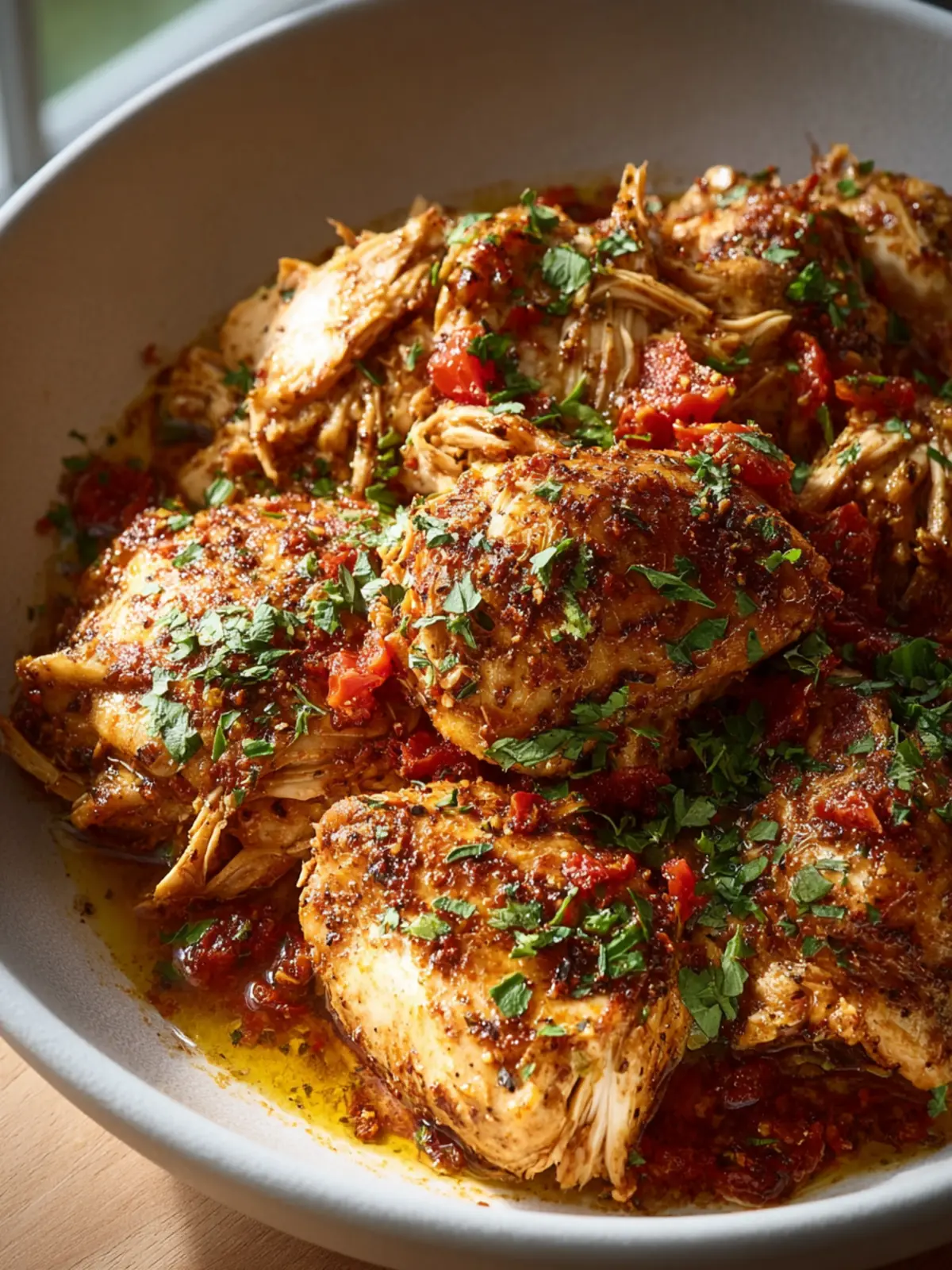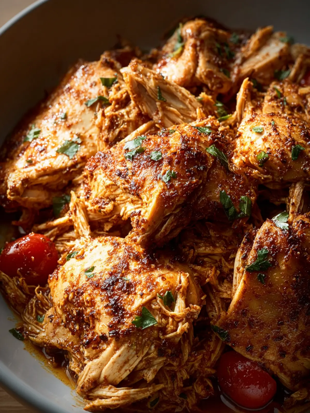 - Shred the chicken and mix it with the juices before serving.