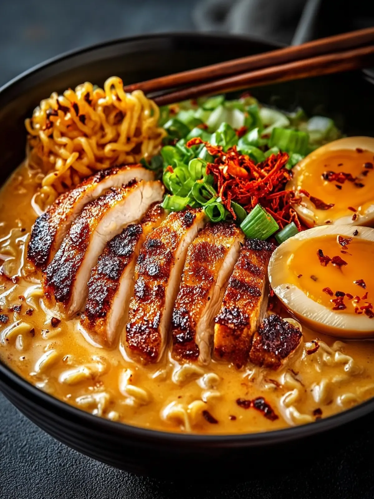 This creamy chicken ramen is a flavorful dish that combines tender chicken thighs, rich broth, and hearty noodles for a comforting meal.