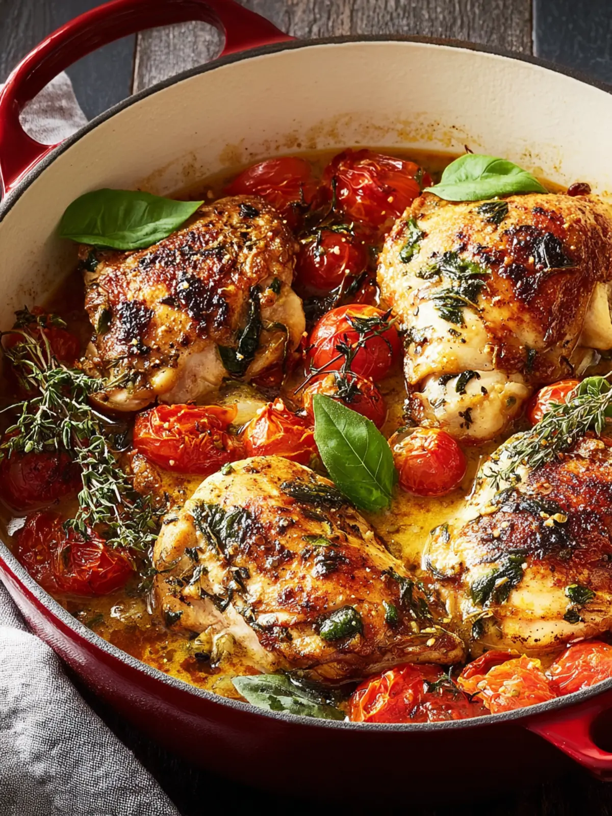 A delicious and easy garlic chicken recipe featuring juicy cherry tomatoes and fresh basil.