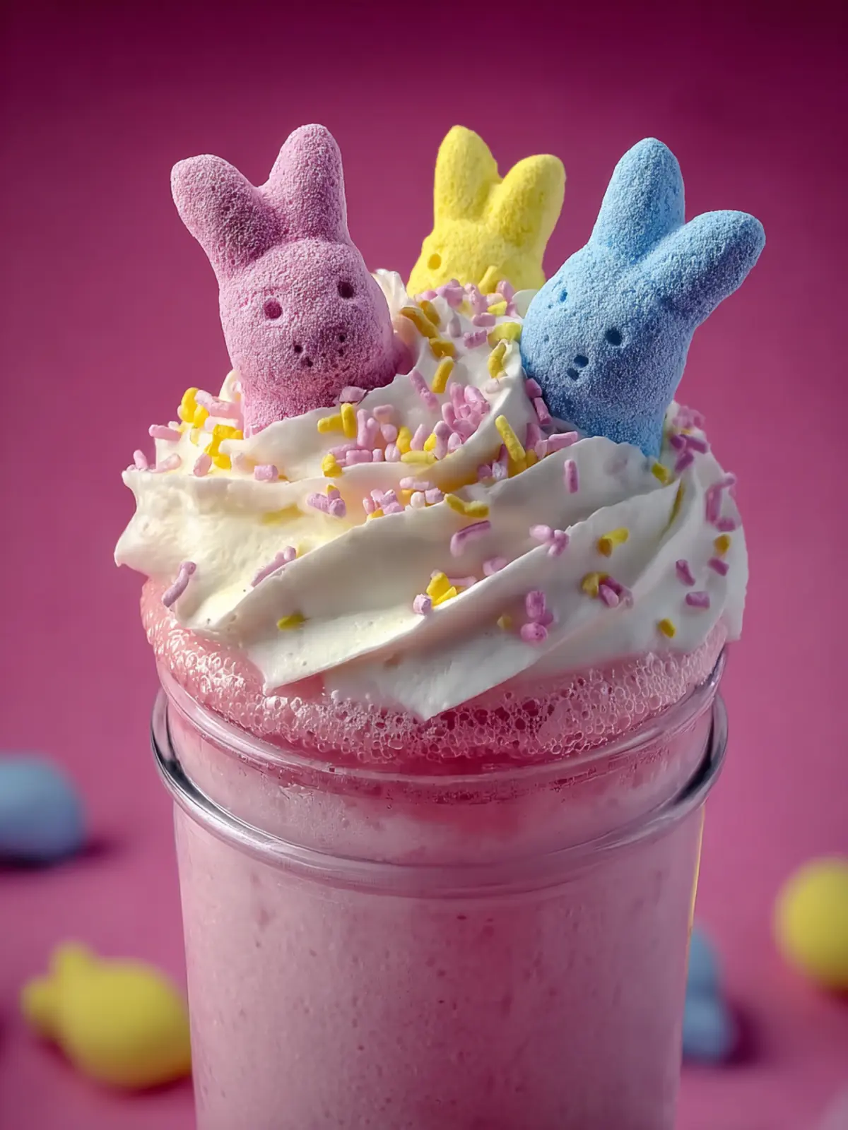 A delicious and creamy milkshake featuring the playful flavors of Peeps marshmallows.