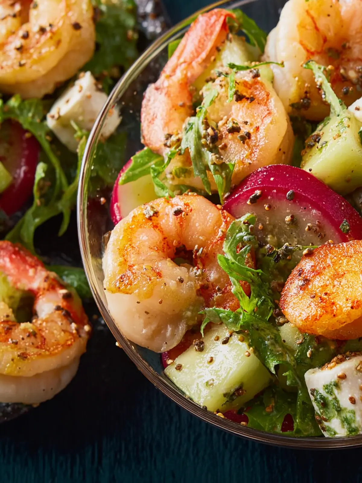 Avocado: A firm avocado introduces a creamy texture, enhancing the salad and complementing the juicy shrimp beautifully.