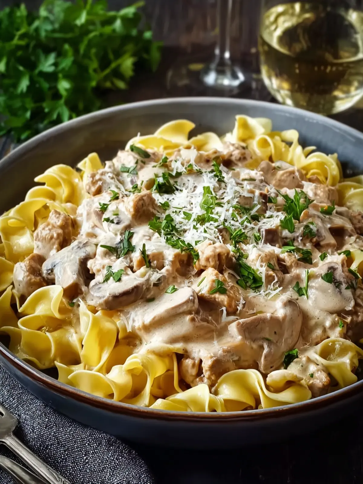 - Add the cooked egg noodles to the turkey mushroom mixture, gently tossing until everything is well-coated. Serve immediately, garnished with freshly chopped parsley.