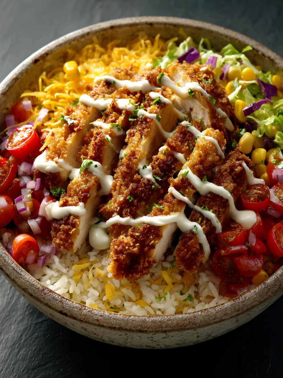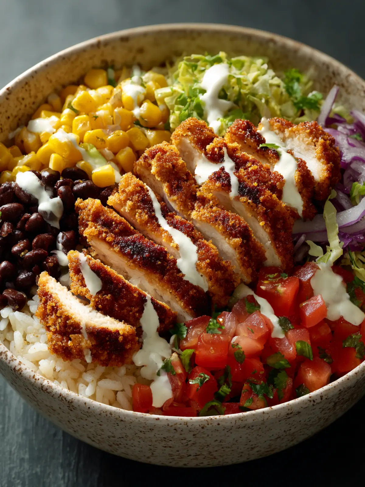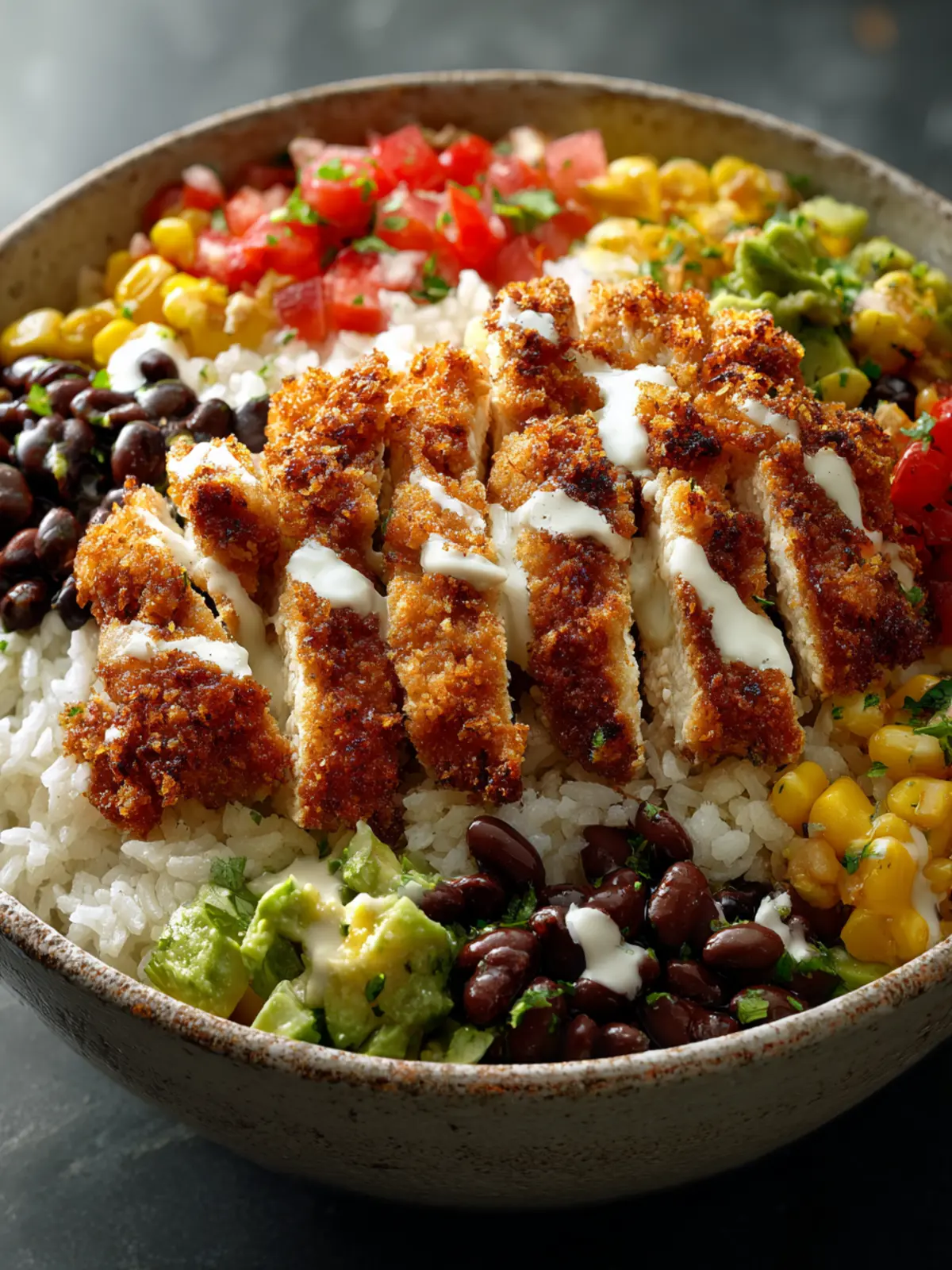 A delicious and hearty crispy fried chicken bowl layered with rice, beans, corn, and tomatoes.